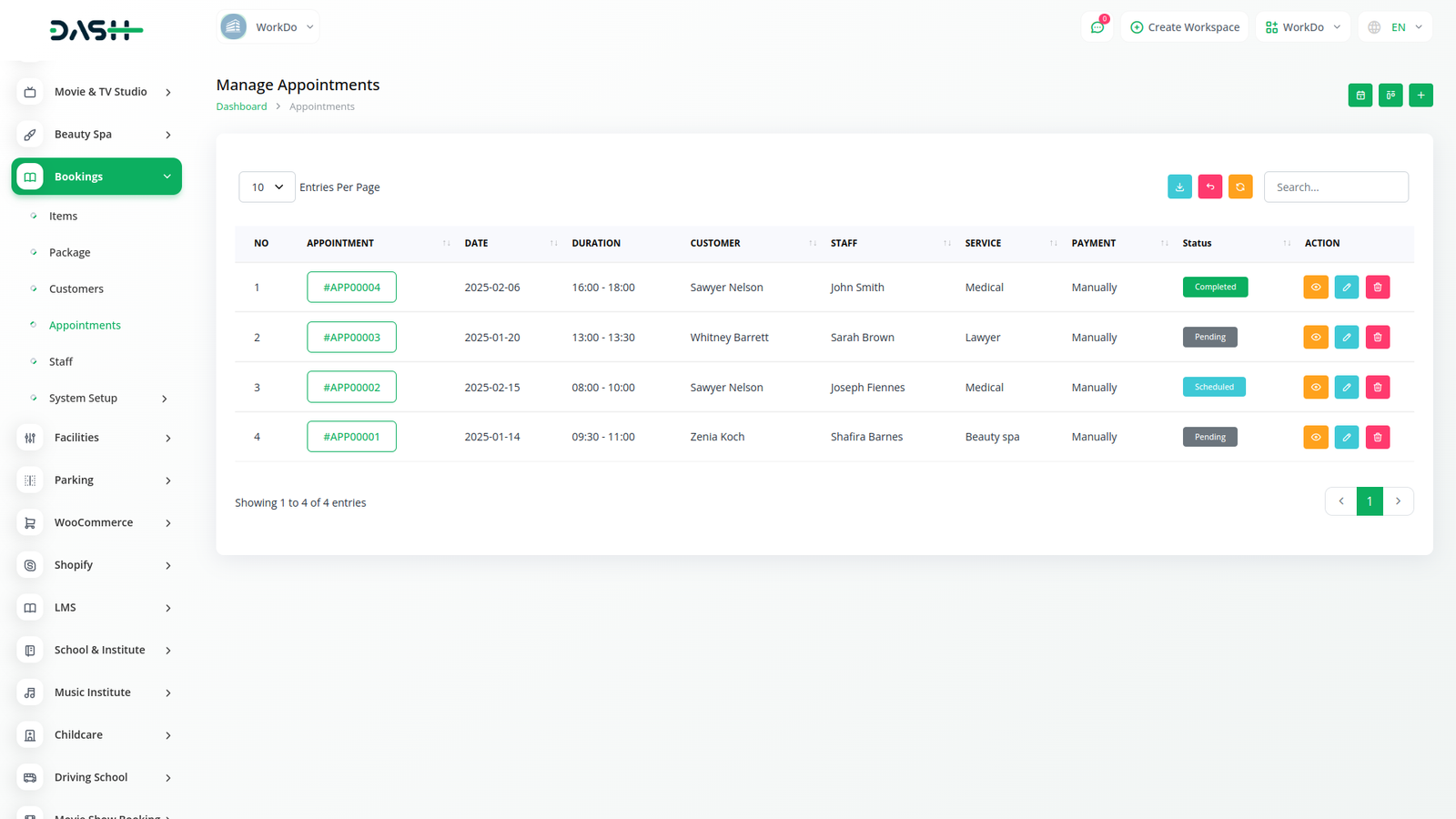 Get valuable insights into your booking trends and business performance with the Dash Saas Bookings Module/s analytics. Track important metrics like appointment numbers, peak booking times, and customer preferences. Use this data to make better decisions about staffing, marketing, and services. Our simple reports and dashboards give you a clear view of how your booking system is doing, helping you improve efficiency and profitability. Plus, you can manage bookings from both the backend and frontend, giving you complete control and flexibility over your scheduling process.