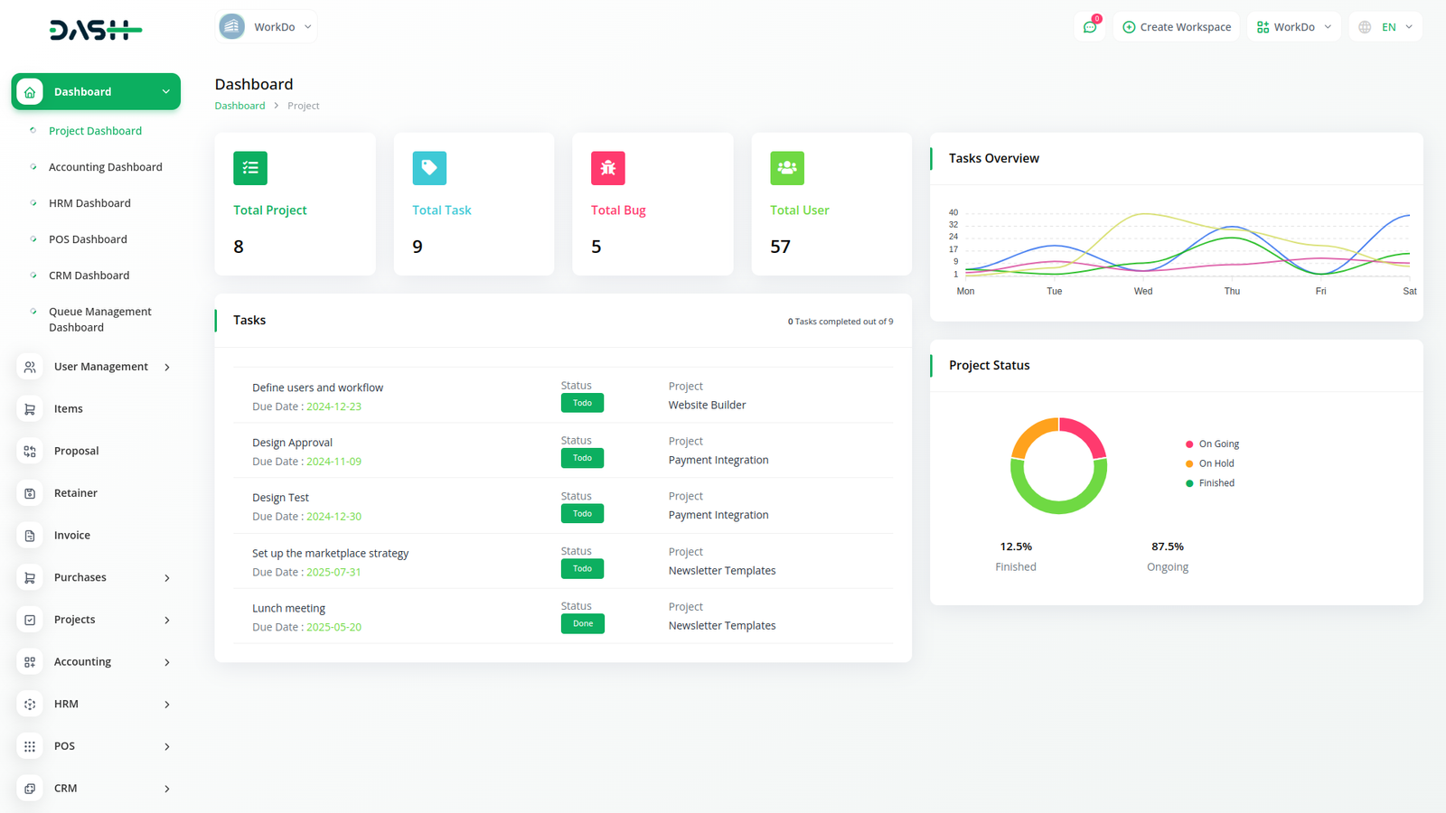 Dapatkan ikhtisar jumlah total proyek, tugas, bug, dan anggota. Representasi visual ikhtisar tugas dan status proyek dapat membantu Anda memperkirakan progres setiap tugas. Terakhir, Anda dapat memeriksa tugas yang paling cepat selesai.